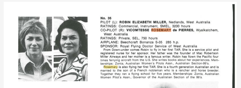 Rosemary was the Governor of the 99’s West Australian chapter and she and her vice-governor, Robin Miller competed in the BP Air Race in January 1973.